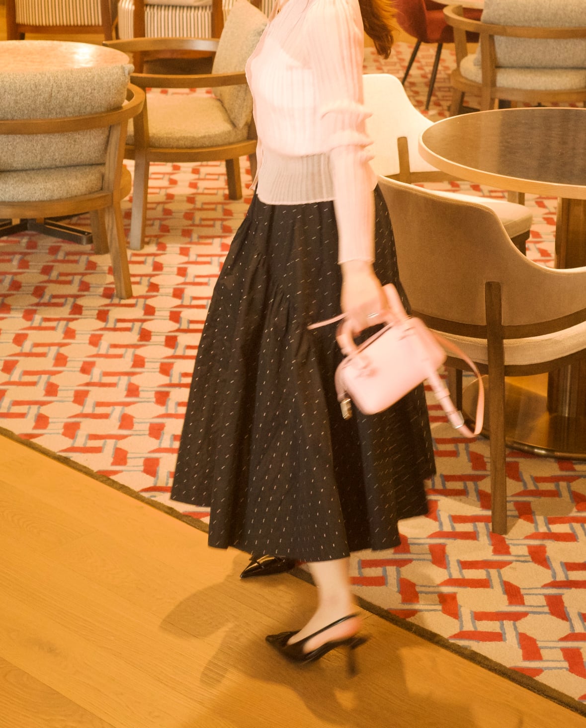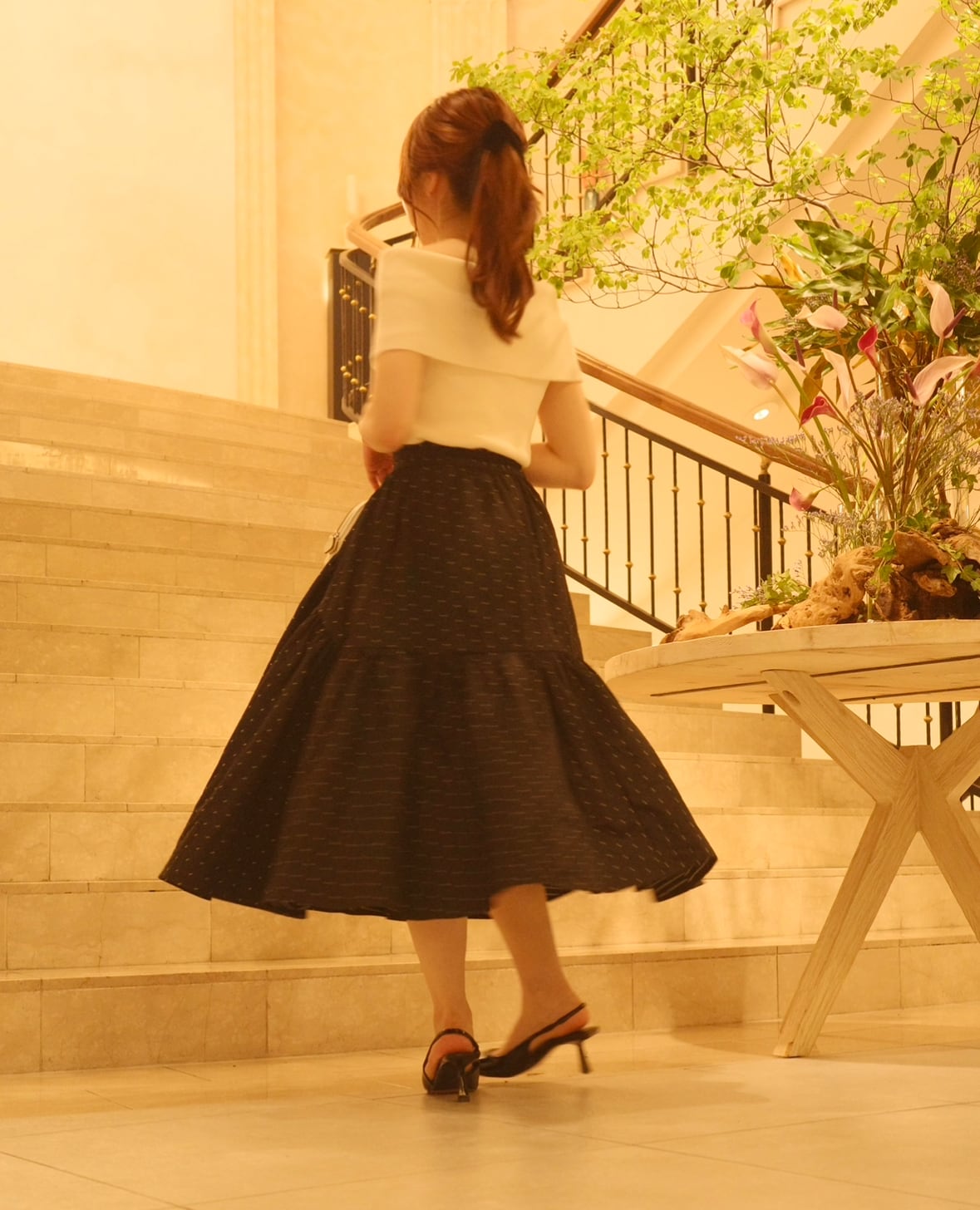 •高密度に織り上げた先染め形状記憶ジャガード生地を贅沢に使用し、まるでドレスのようにふんわりと広がるドット柄フレアスカートです。