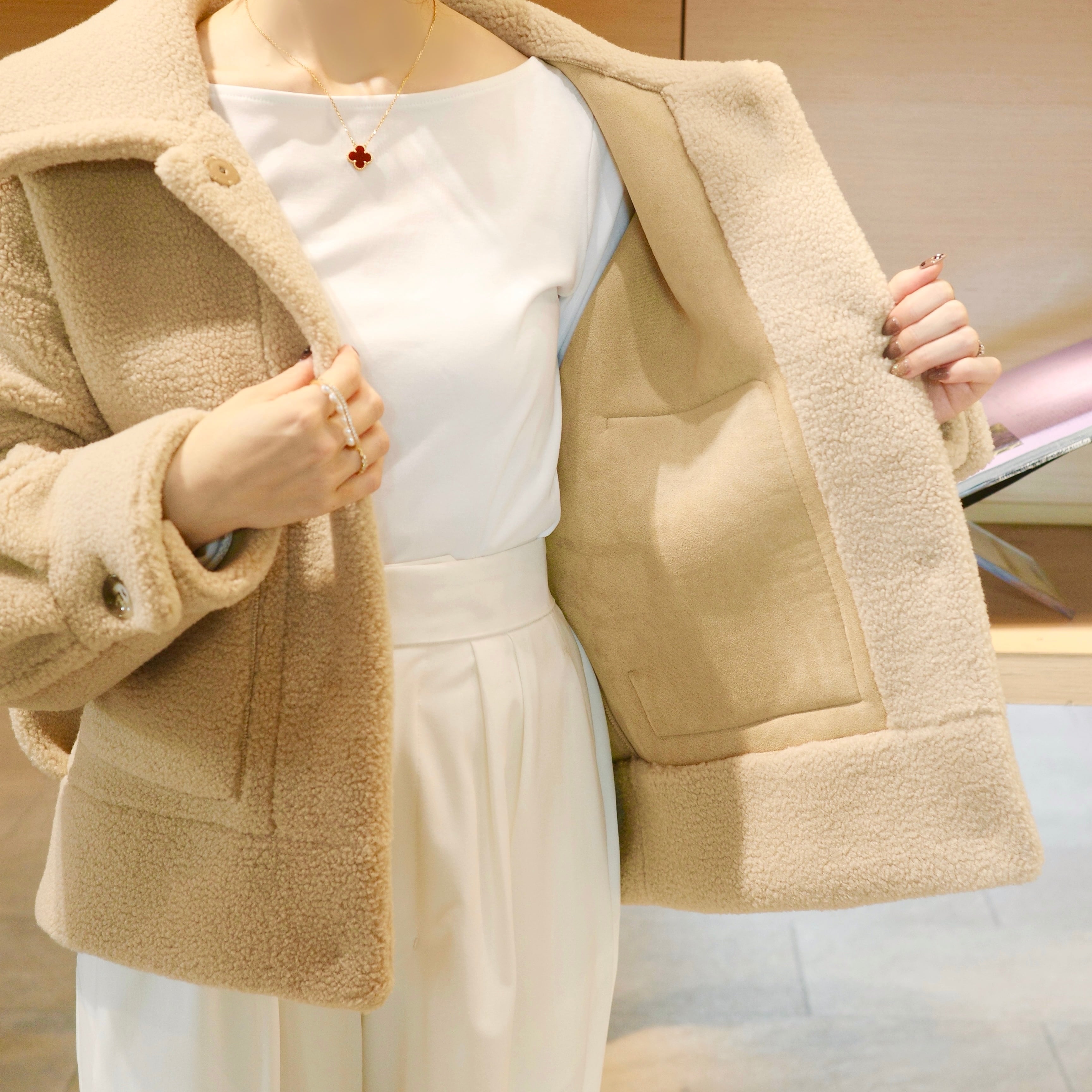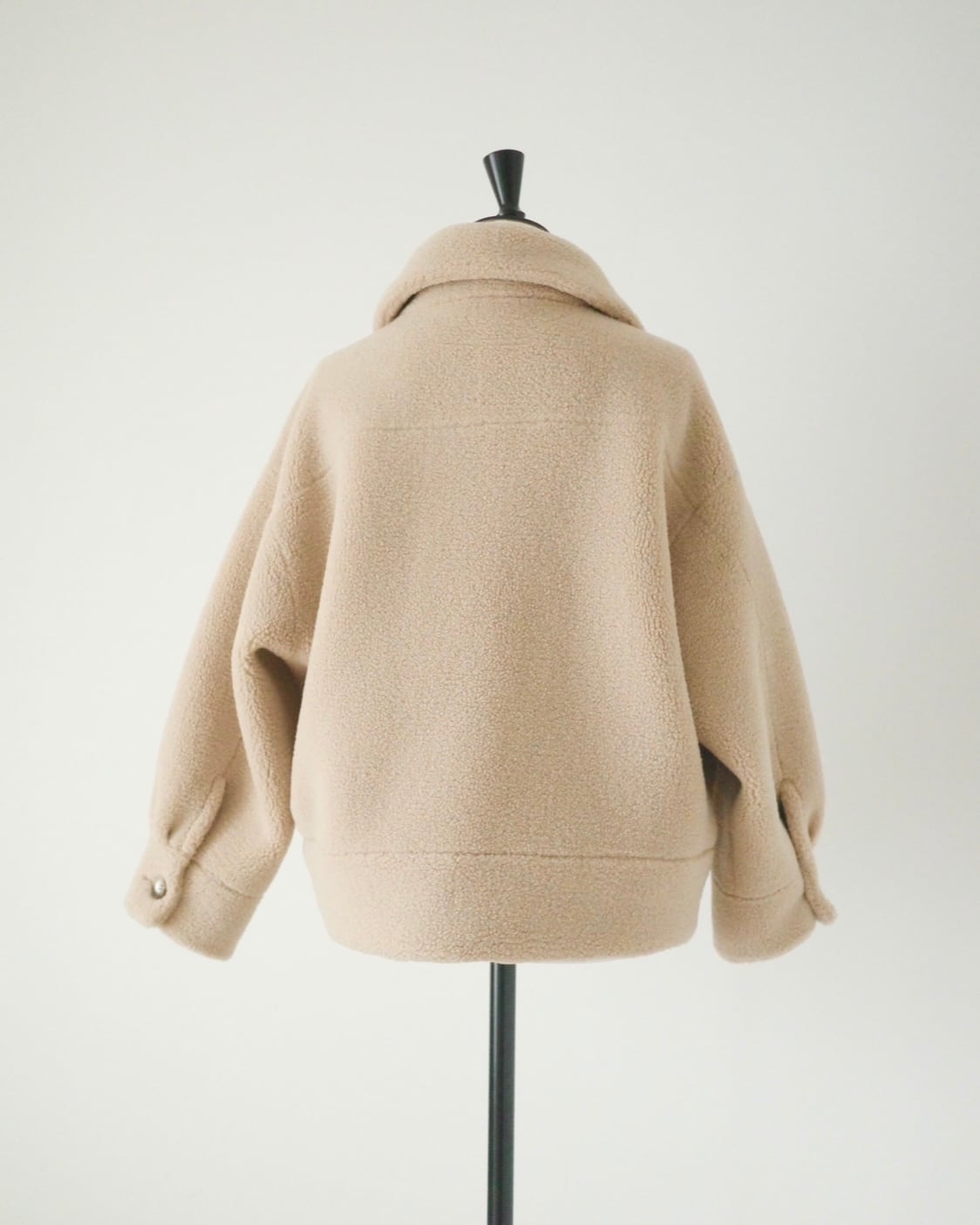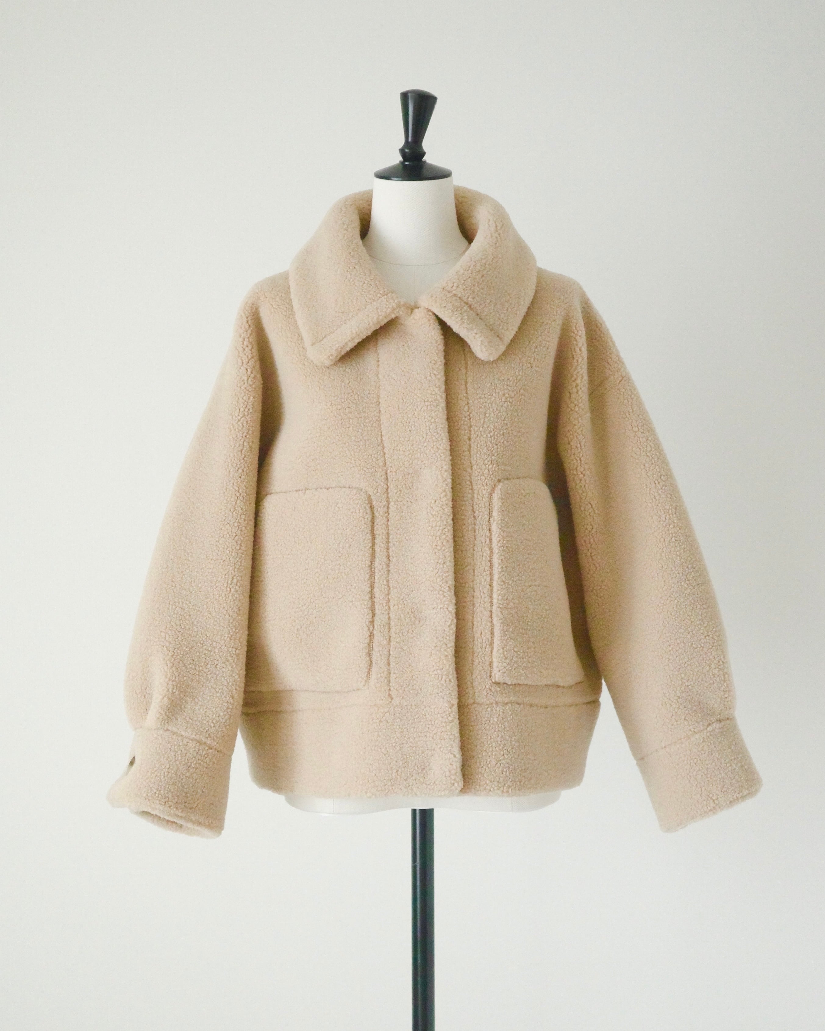 リュクスなエコムートン素材を使用した、フェミニンさと上品さを兼ね備えたボアショートコート。
