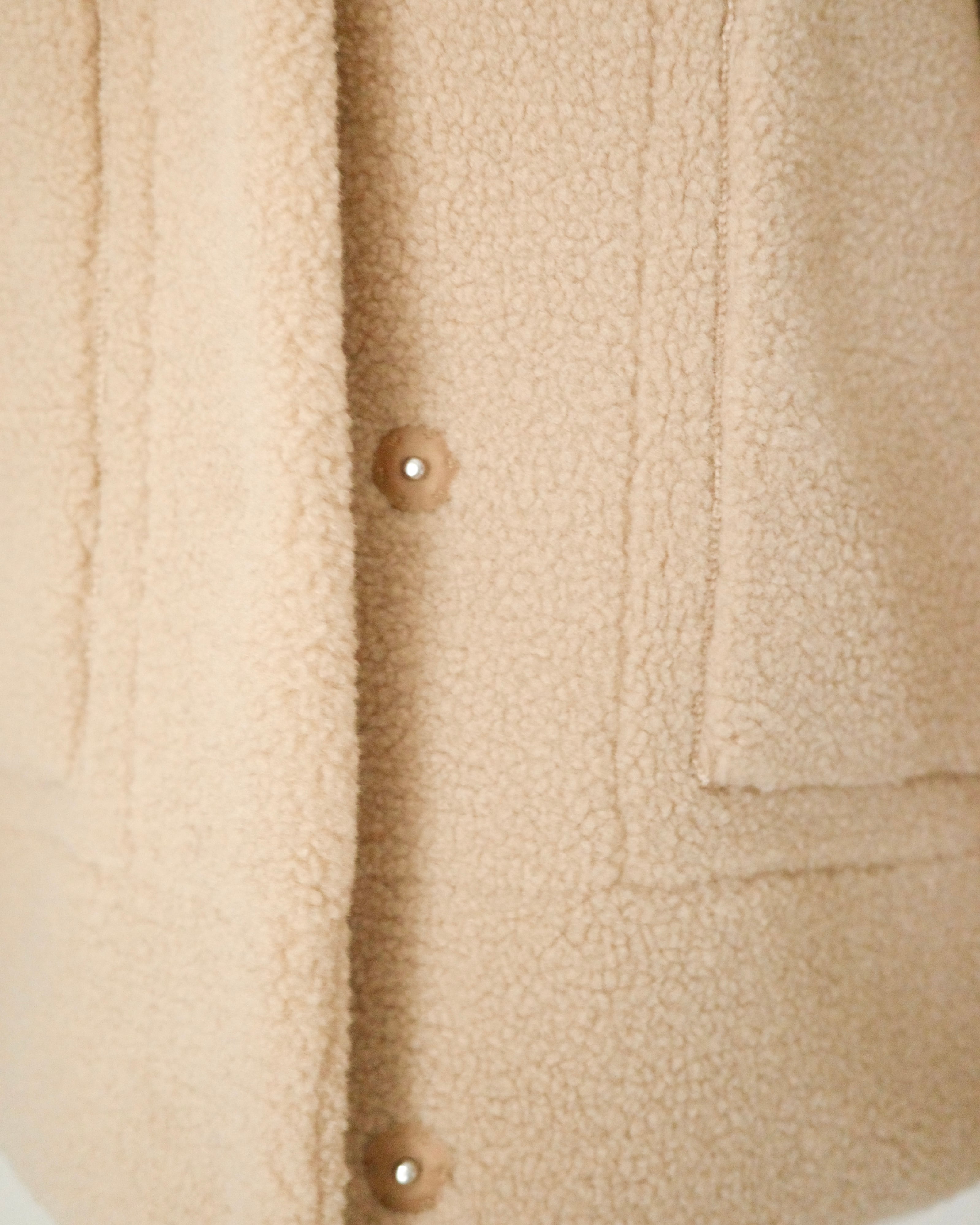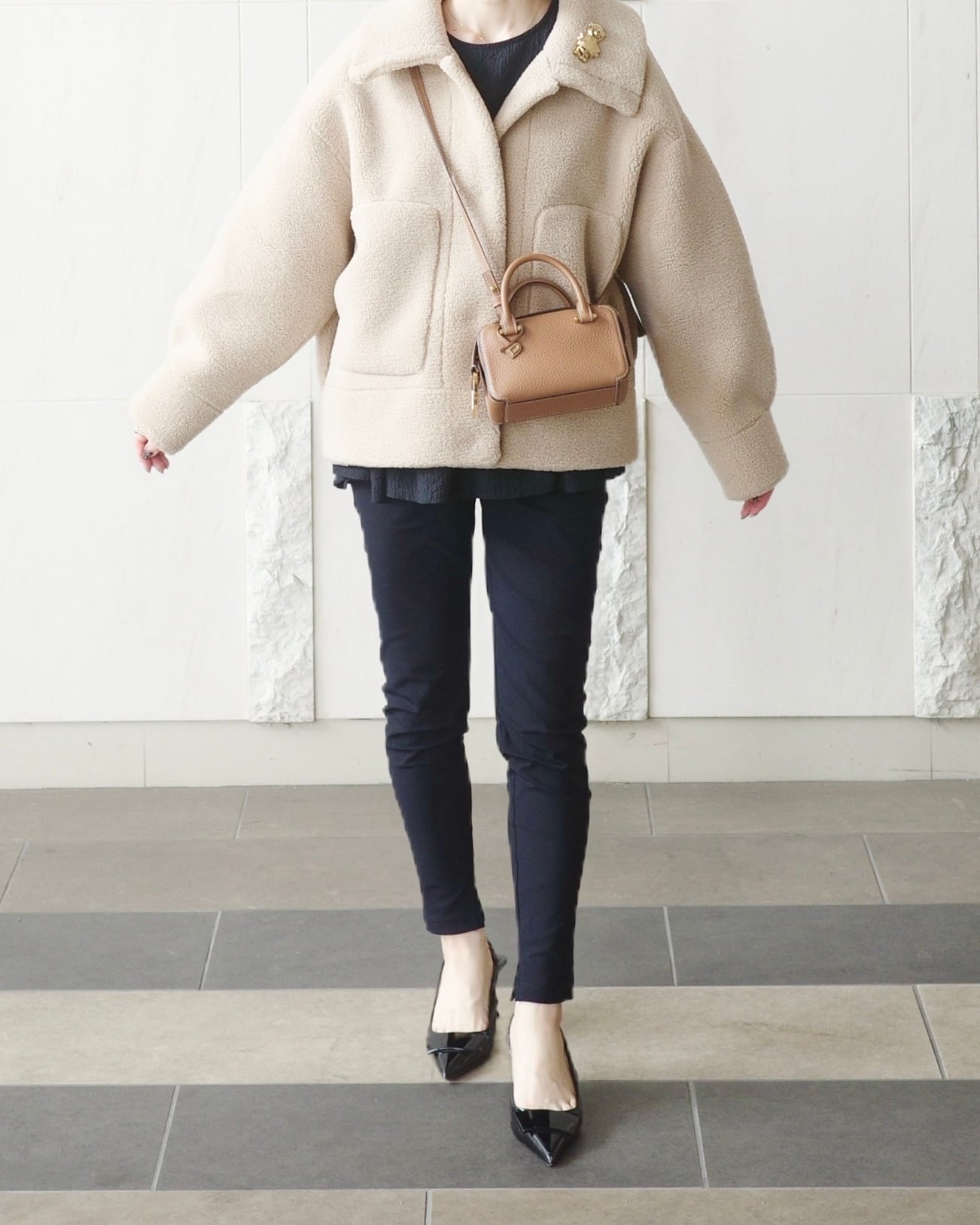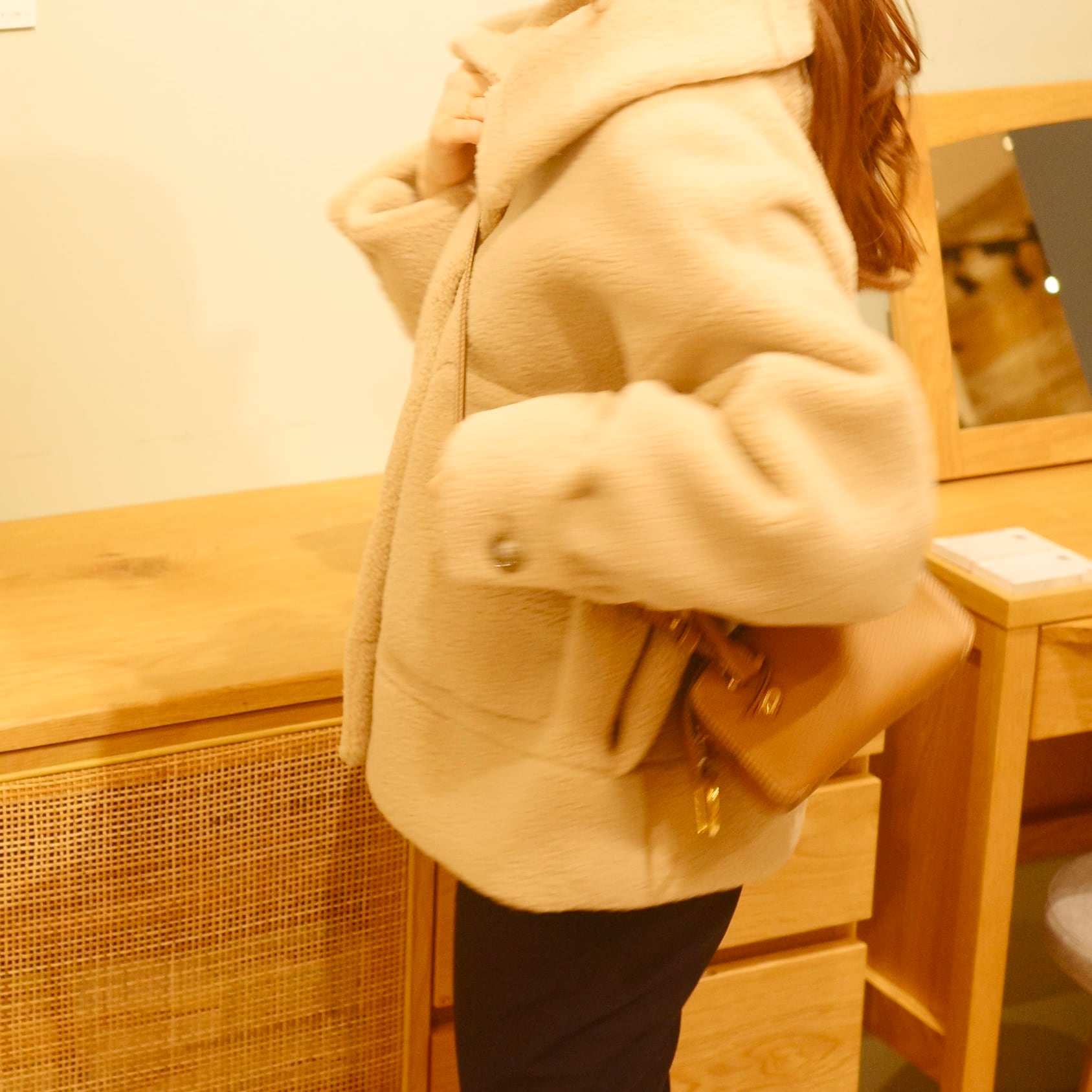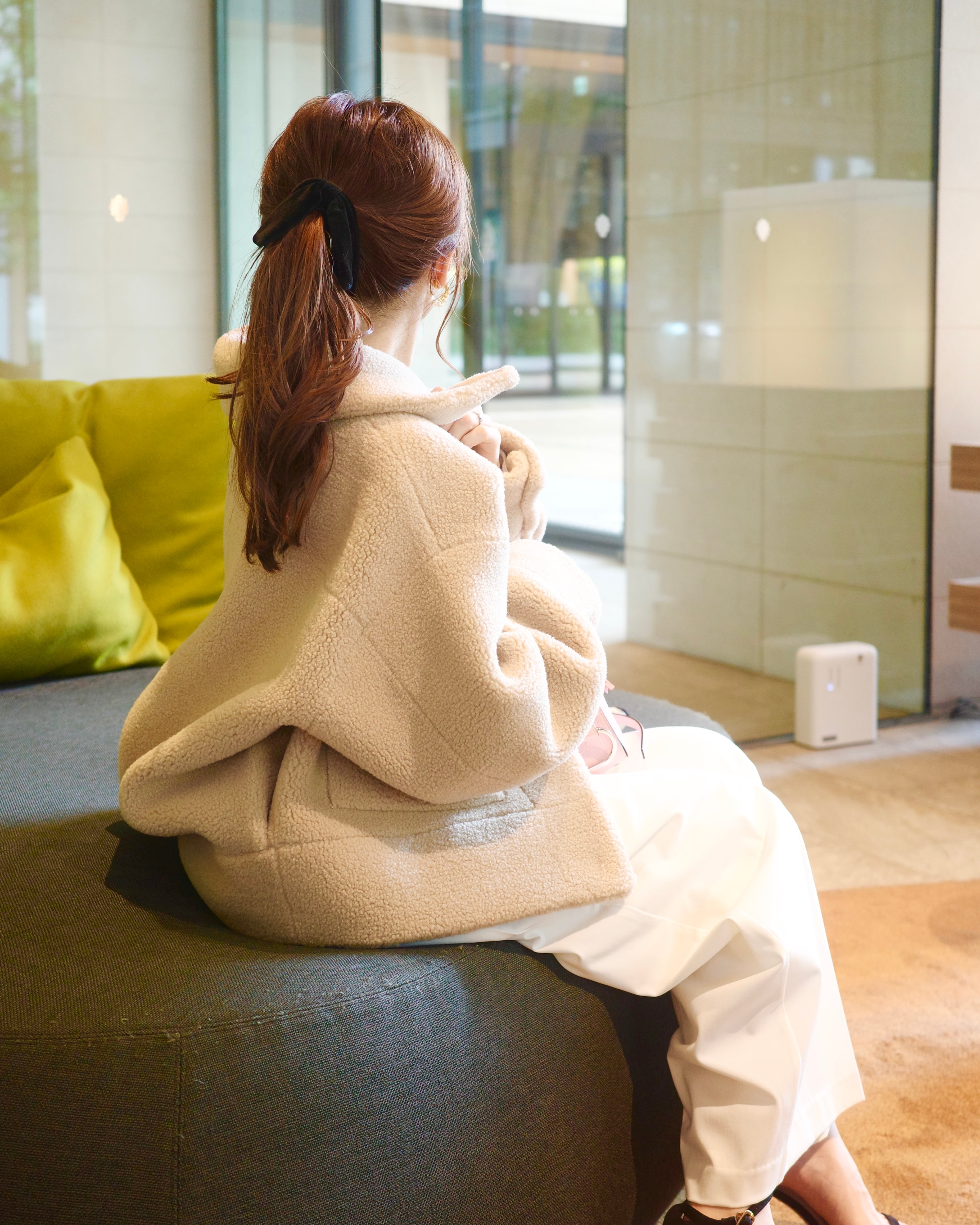 リュクスなエコムートン素材を使用した、フェミニンさと上品さを兼ね備えたボアショートコート。