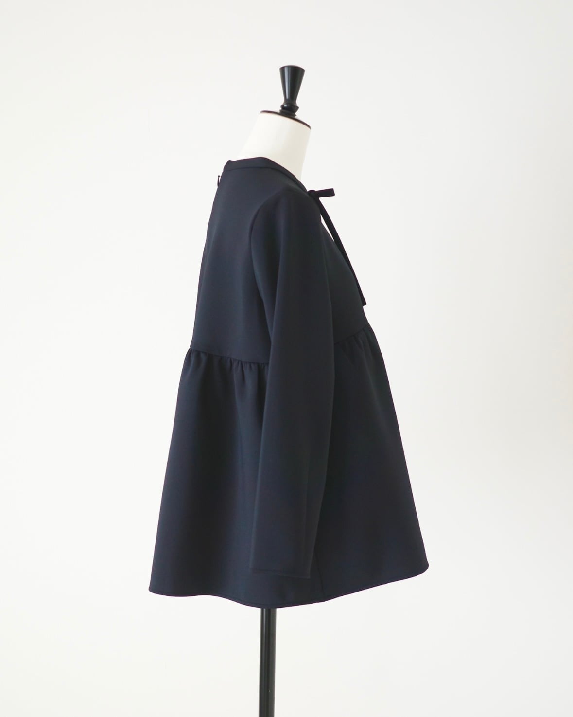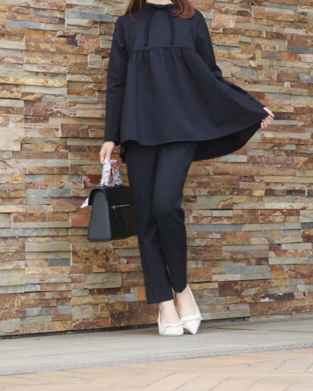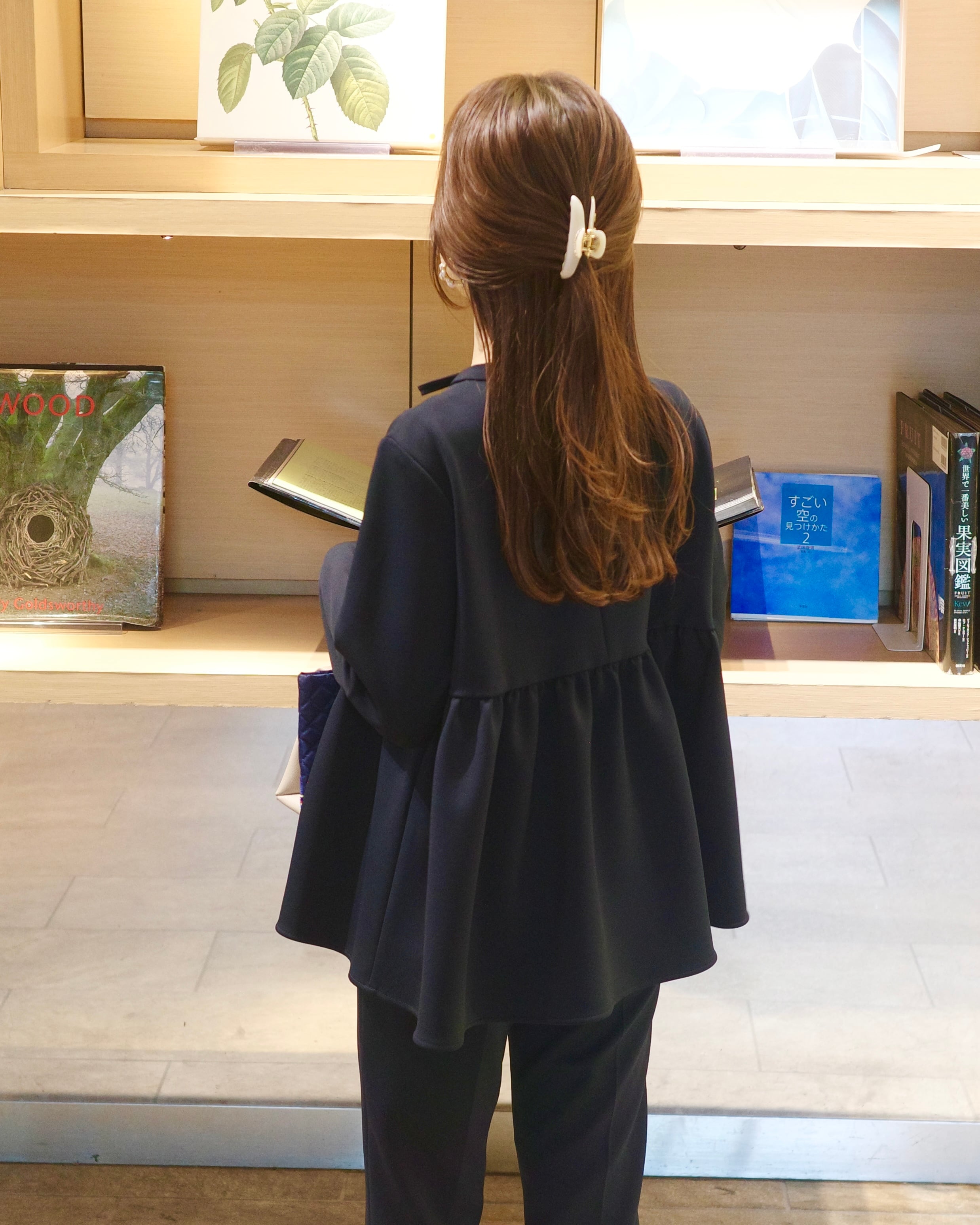 •胸下からふんわり広がるペプラムシルエットはウエスト位置が高く見え、スタイルアップ効果も。甘さときちんとさを兼ね備えた絶妙なボリューム感で、小柄さんがバランス良く着れるシルエットに仕上げました。