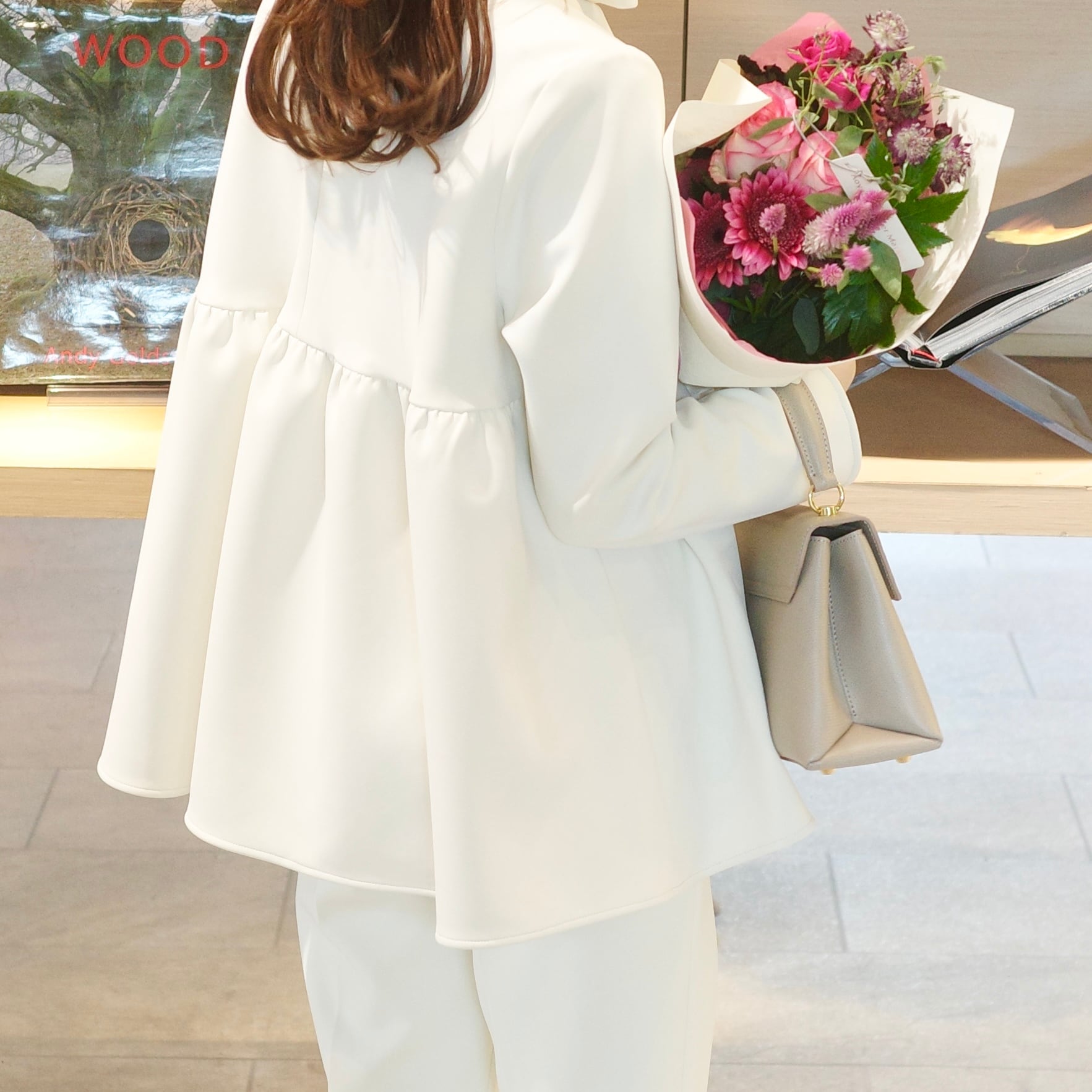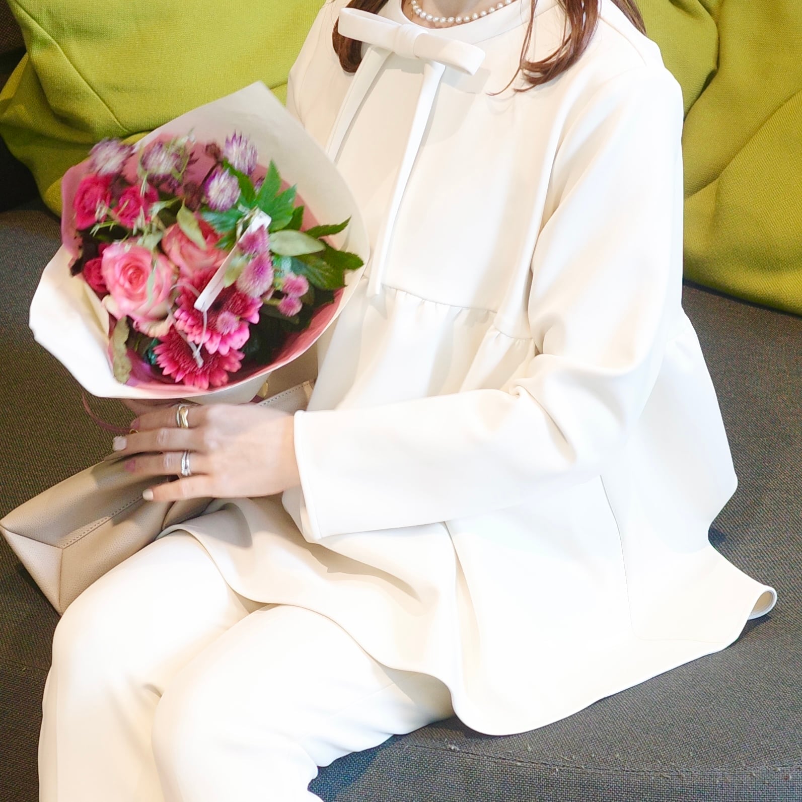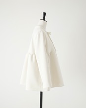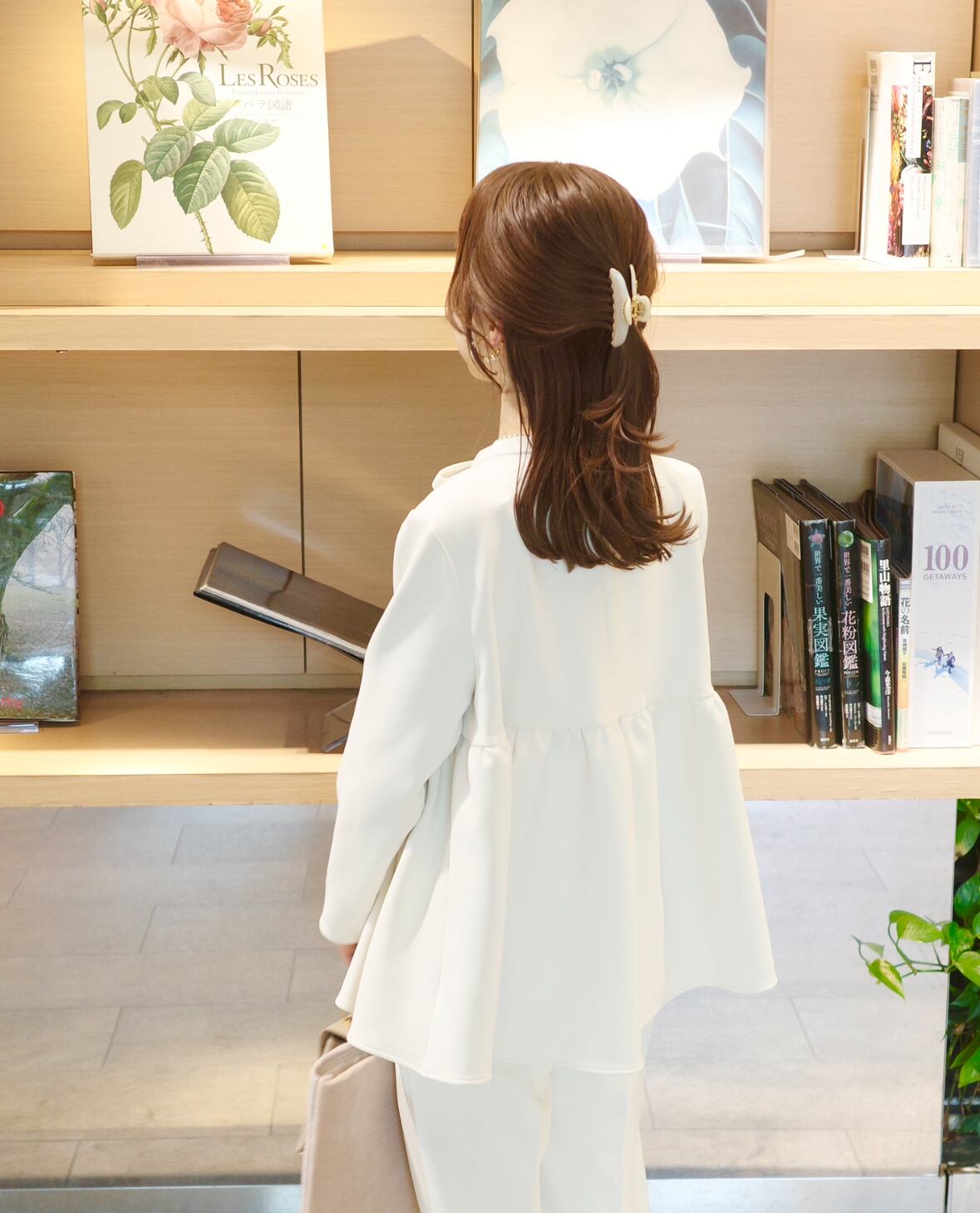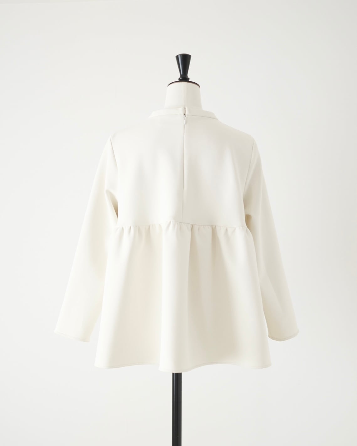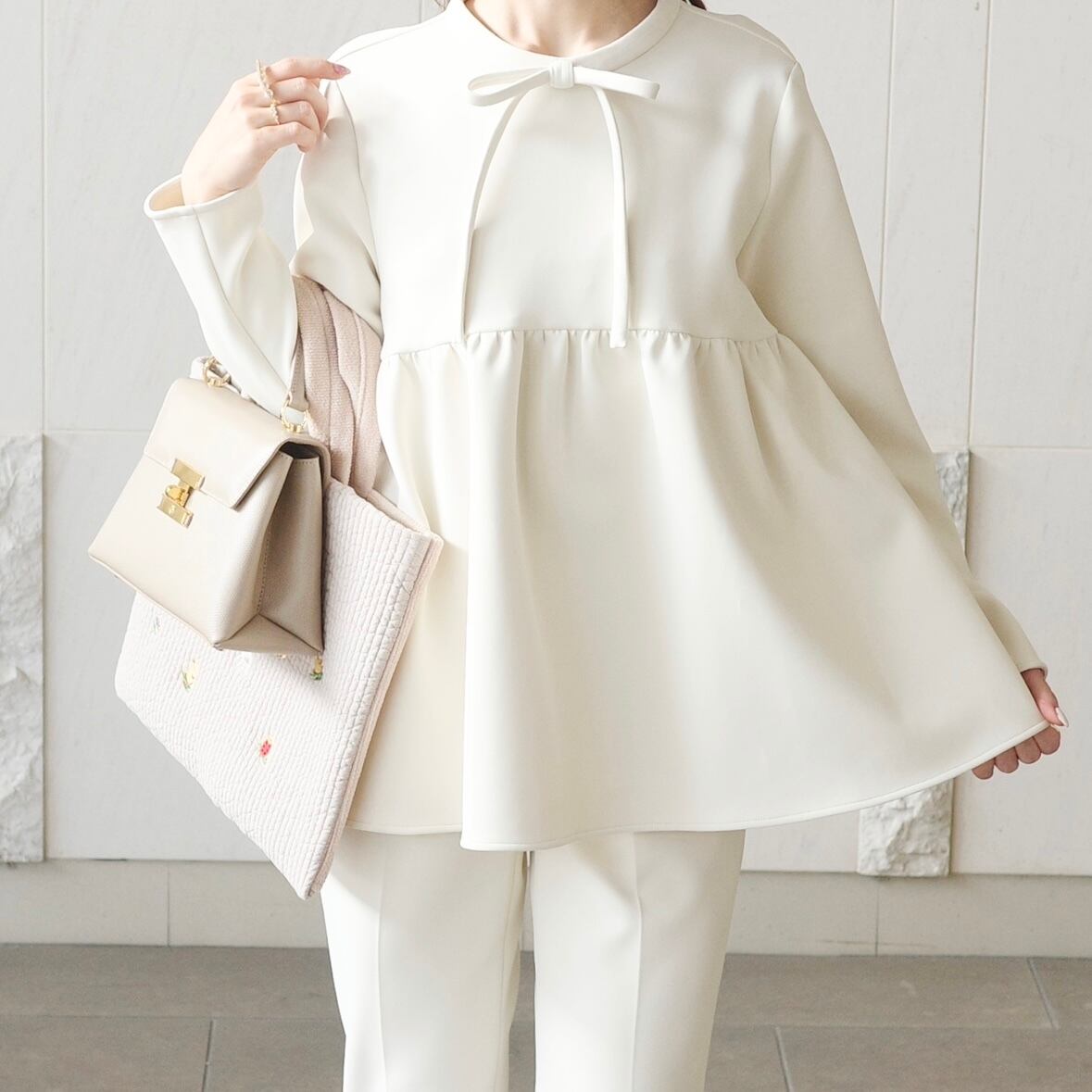 •胸下からふんわり広がるペプラムシルエットはウエスト位置が高く見え、スタイルアップ効果も。甘さときちんとさを兼ね備えた絶妙なボリューム感で、小柄さんがバランス良く着れるシルエットに仕上げました。