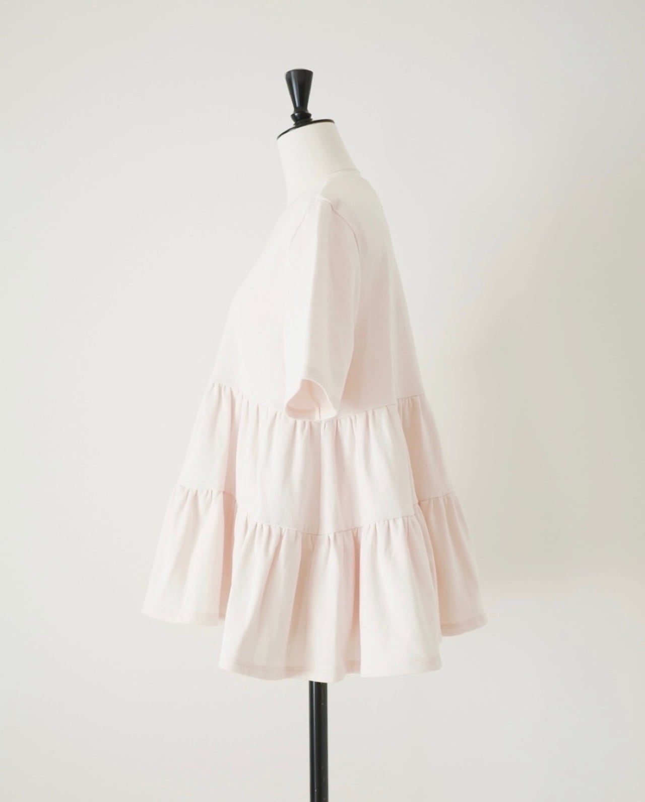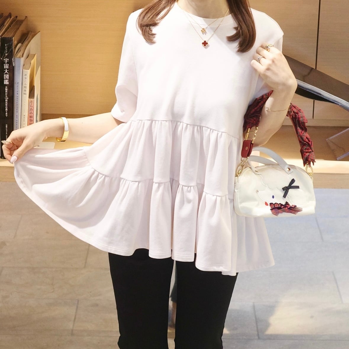 •衿元はリブをあしらい、切替位置にたっぷりとギャザーを寄せたティアードデザイン。小柄さんが細身のパンツやワイドパンツにも合わせやすい、絶妙なサイズ感とボリューム感に拘ってお作りしました。