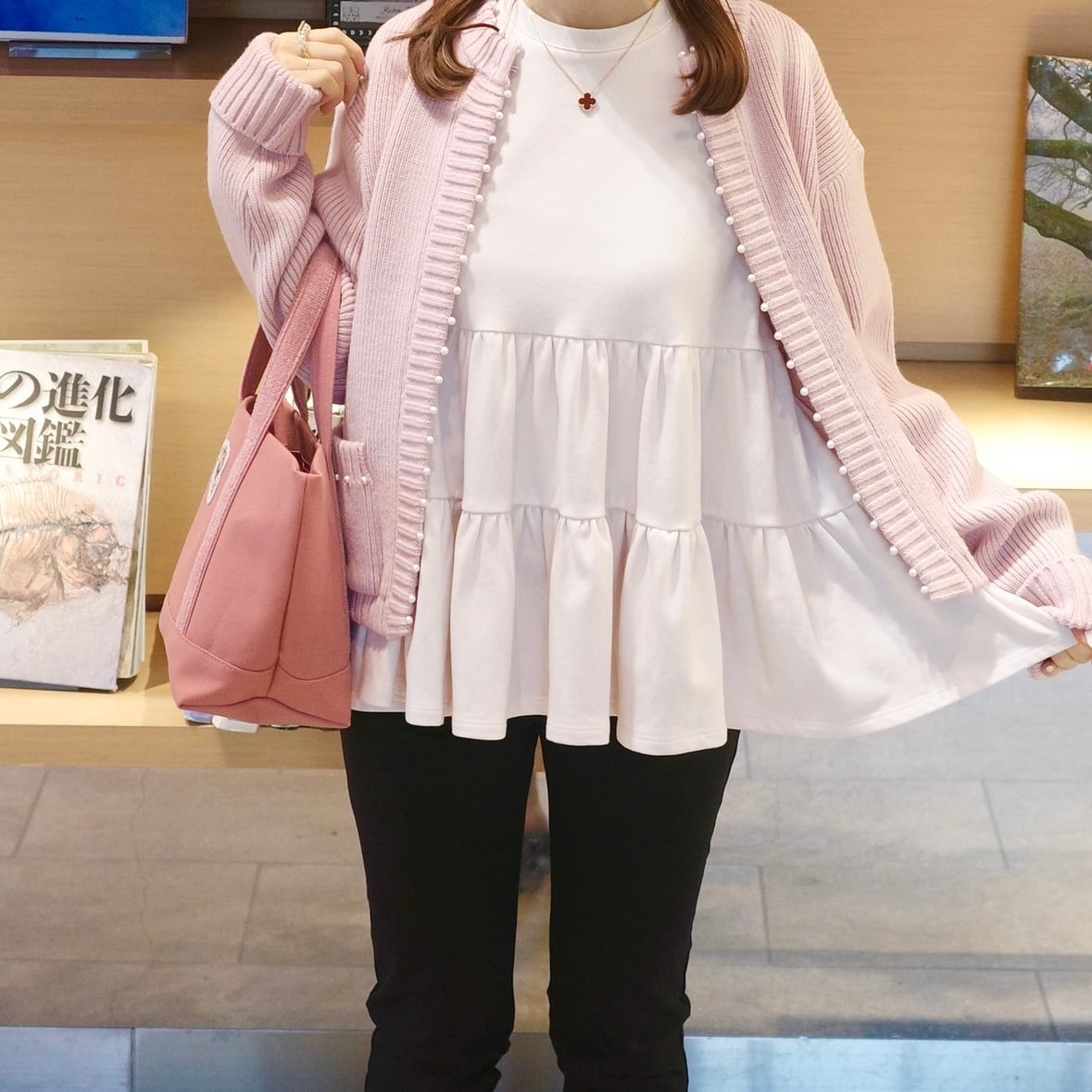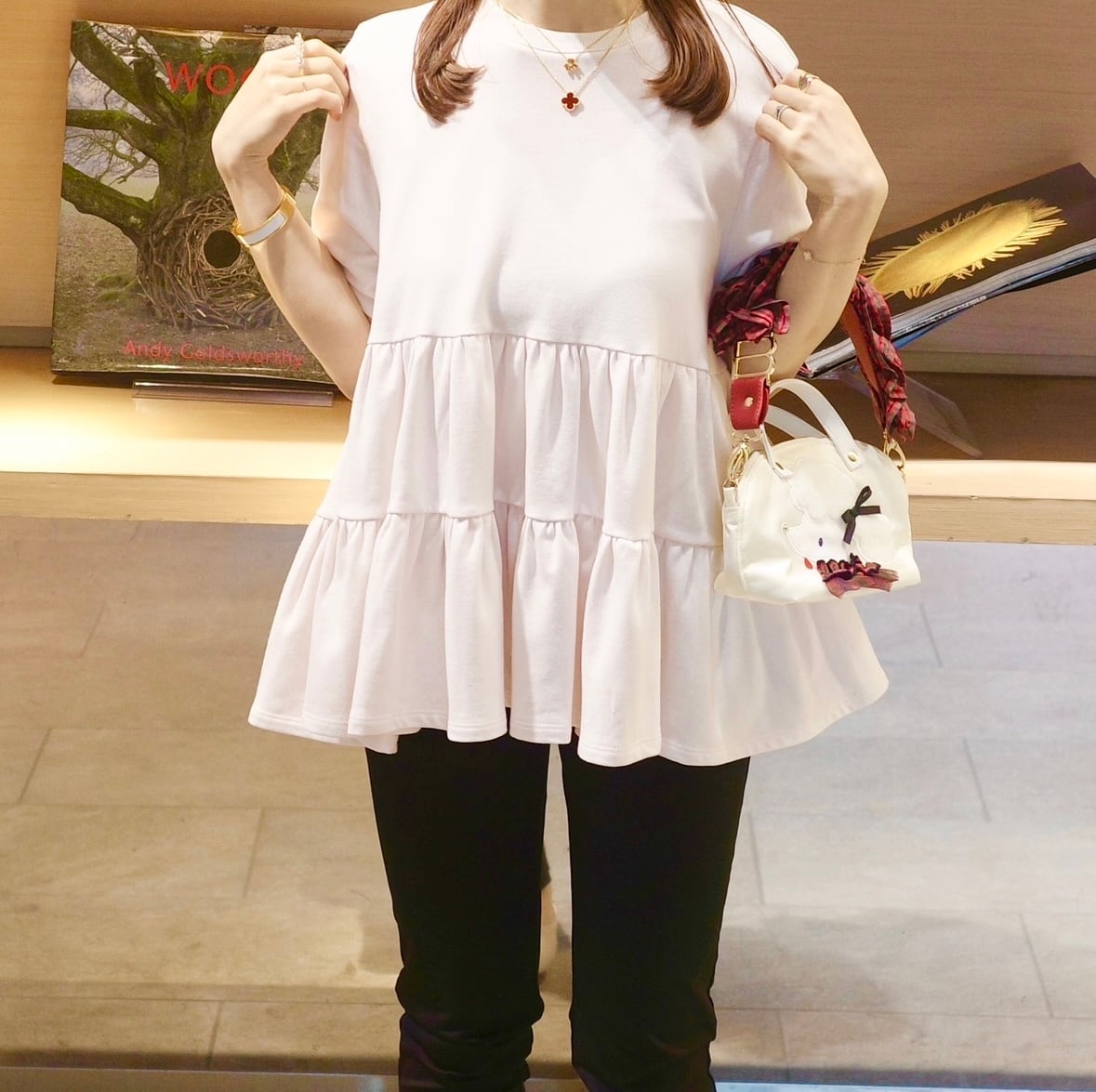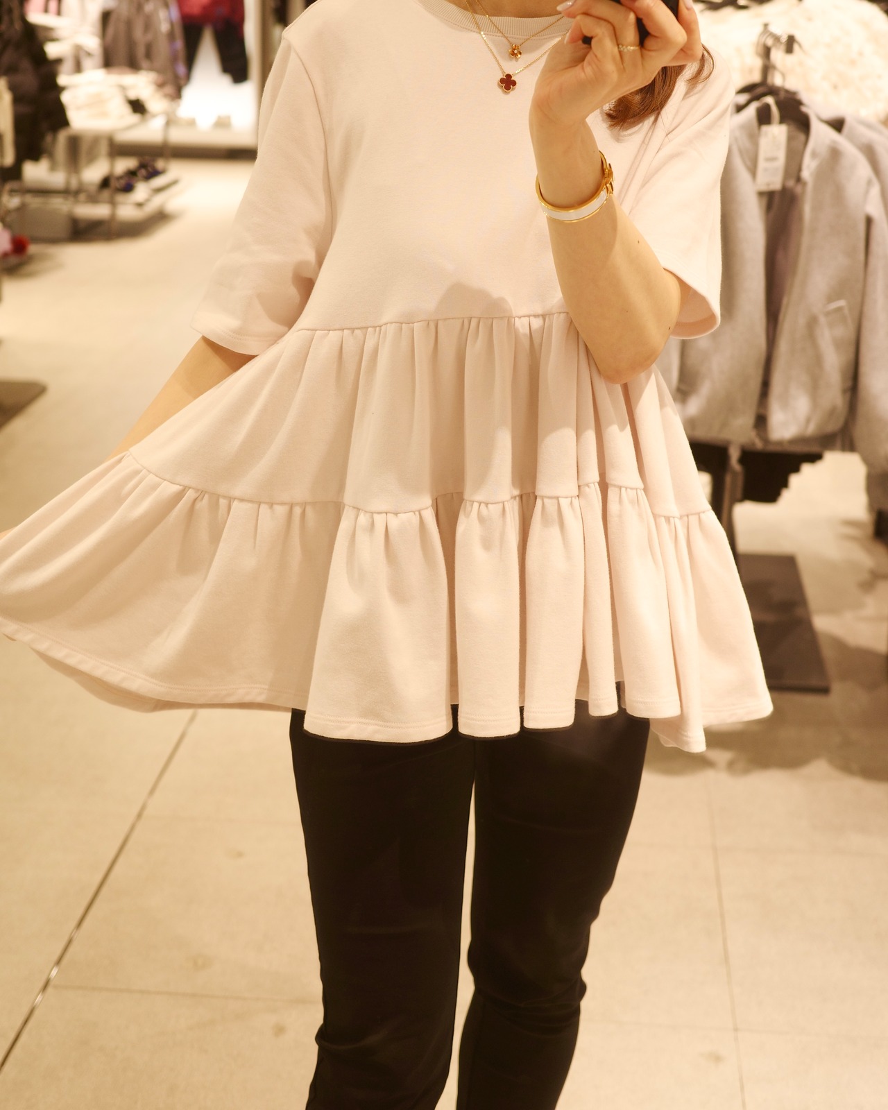 •衿元はリブをあしらい、切替位置にたっぷりとギャザーを寄せたティアードデザイン。小柄さんが細身のパンツやワイドパンツにも合わせやすい、絶妙なサイズ感とボリューム感に拘ってお作りしました。