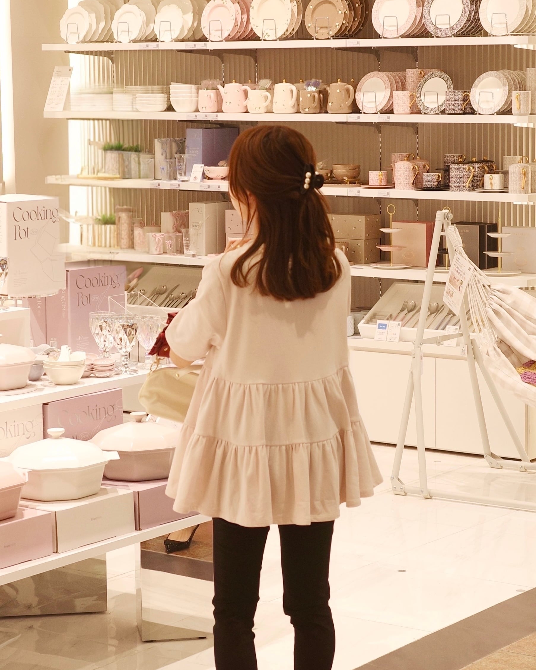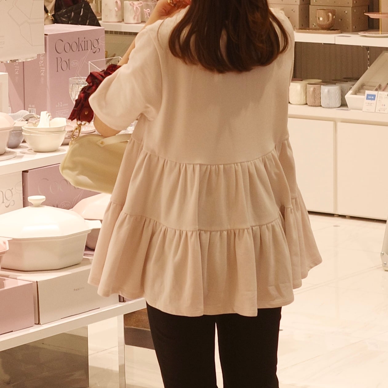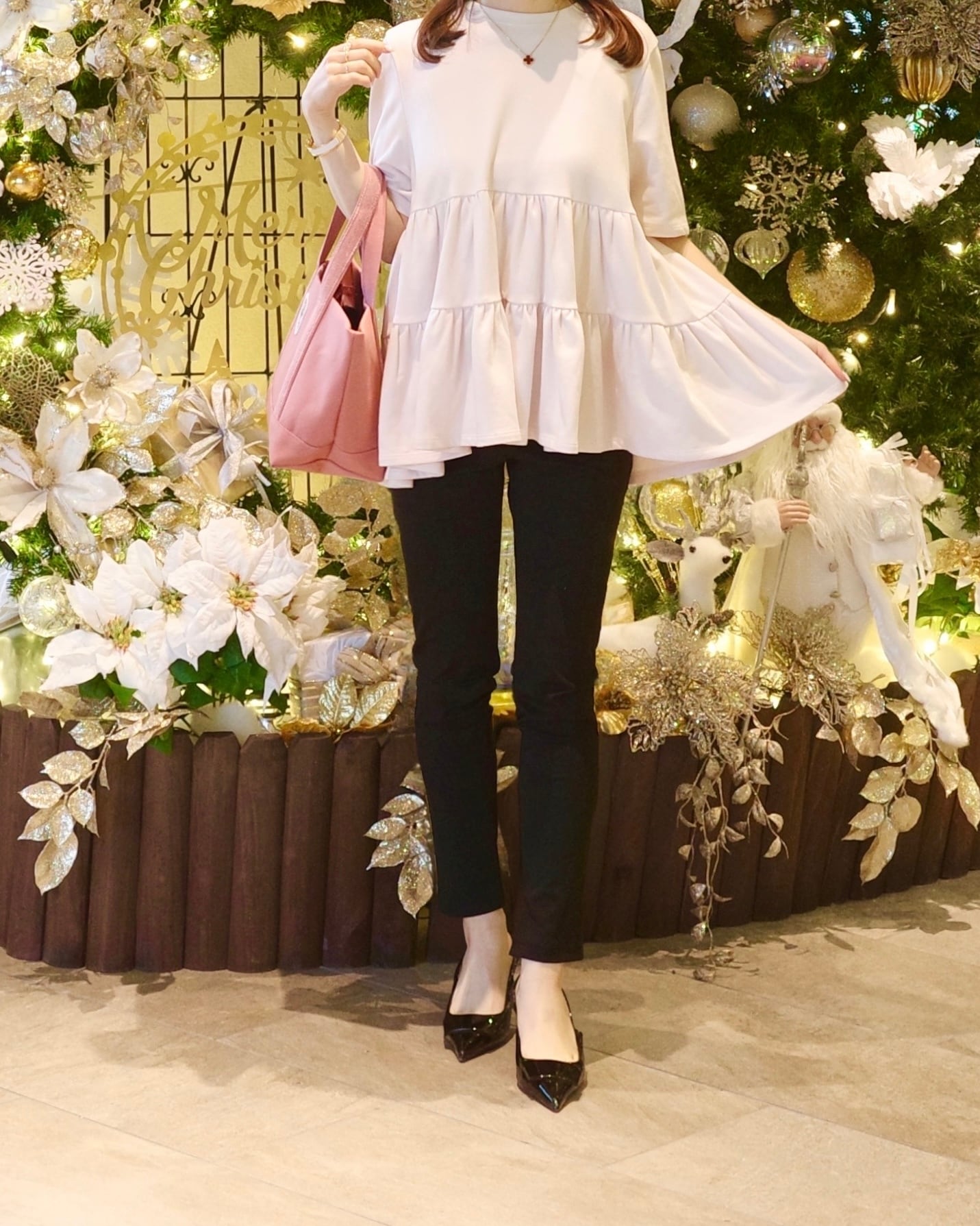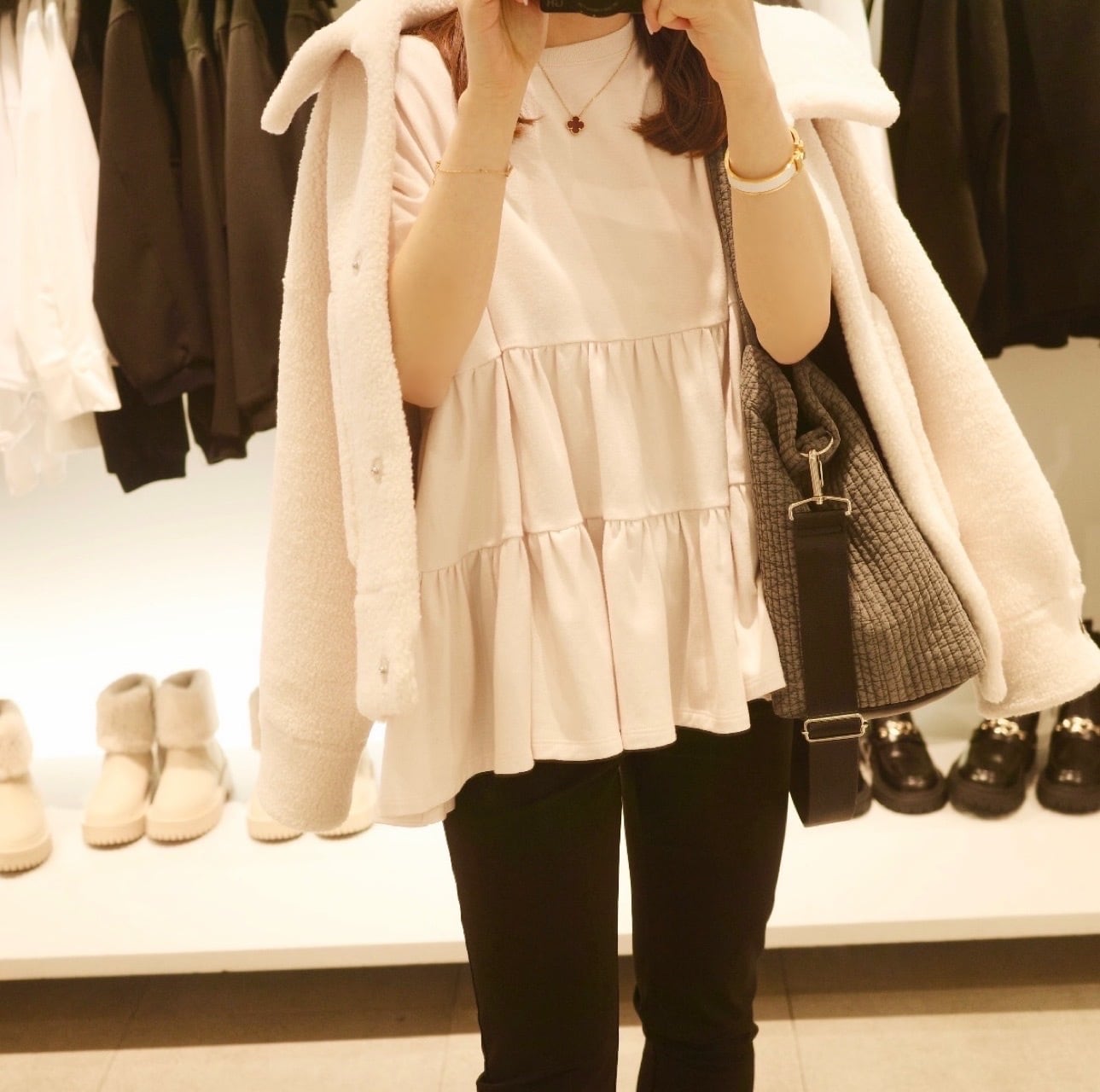 •衿元はリブをあしらい、切替位置にたっぷりとギャザーを寄せたティアードデザイン。小柄さんが細身のパンツやワイドパンツにも合わせやすい、絶妙なサイズ感とボリューム感に拘ってお作りしました。